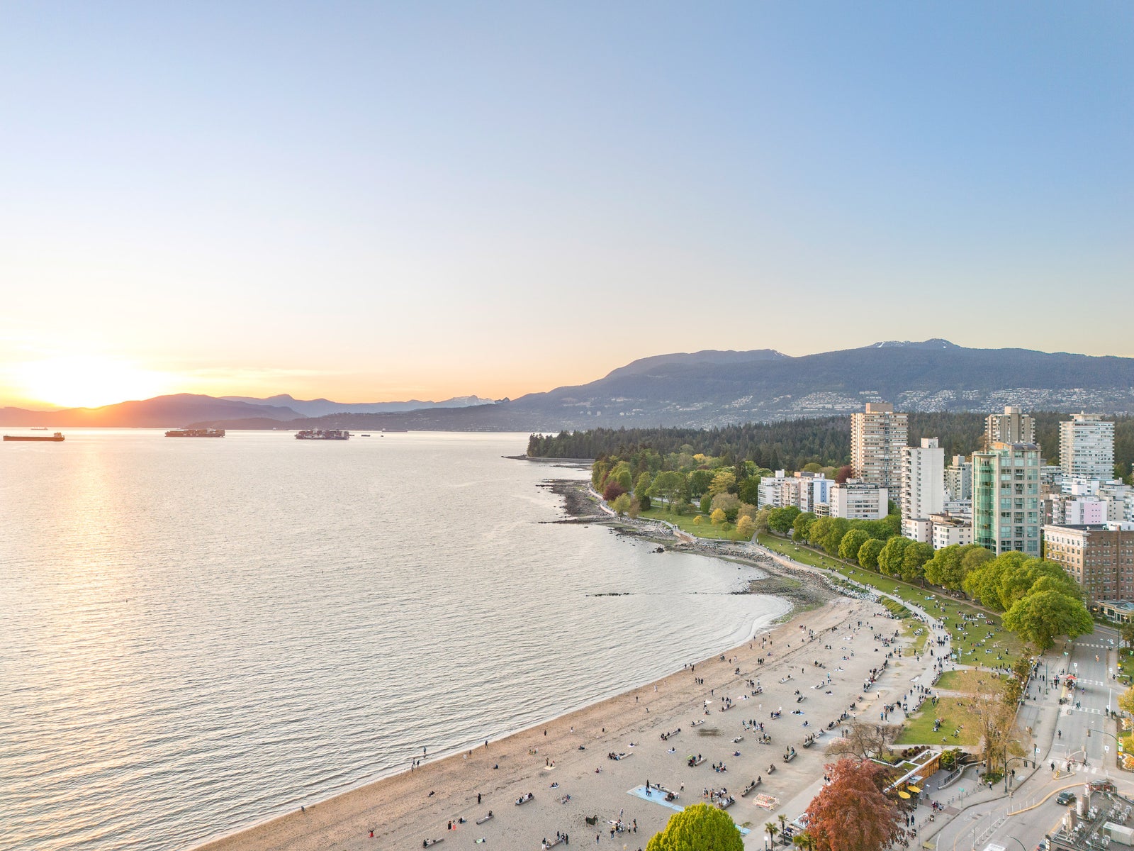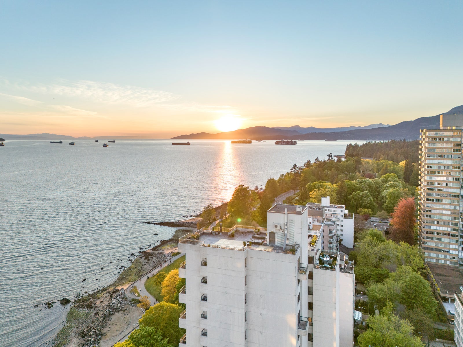 ENGLISH BAY SUB-PENTHOUSE with spectacular water views from every room in the prestigious Huntington West. Features a sunny 26'×14' patio + 3 SW balconies (423 SF total), creating a true “house above the bay” where the seawall meets Stanley Park. Enjoy a full kitchen window framing the ocean, 2 Bedrooms, 1.5 spa-inspired baths, floor-to-ceiling south-facing windows, and a private in-suite sauna—your own exclusive retreat.